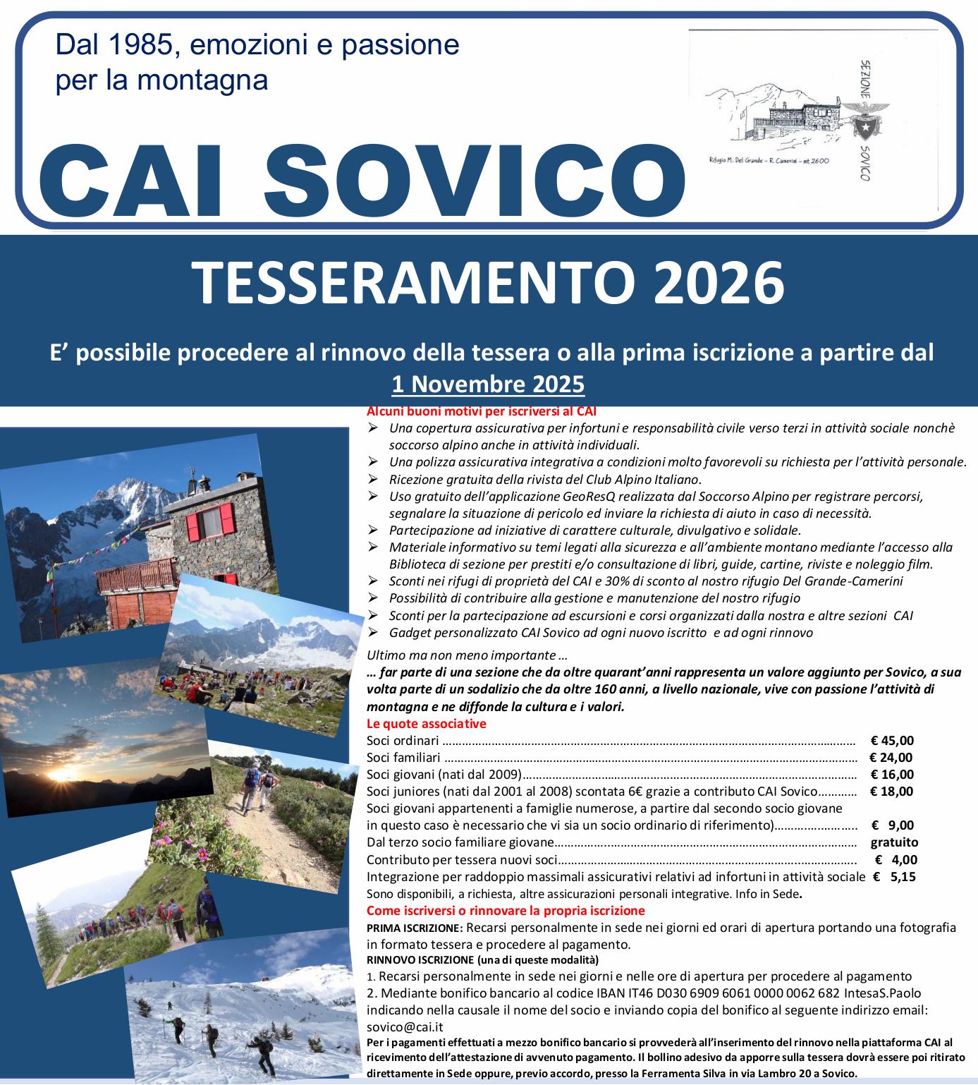 Soci Ordinari : 45.00 Euro Soci Famigliari : 24.00 Euro Soci Giovani (<18 anni): 16.00 Euro Soci Juniores (tra 18 e 25 anni): 18.00 Euro Si Ricorda che senza il bollino 2026 la copertura assicurativa scadrà a Marzo 2026 |